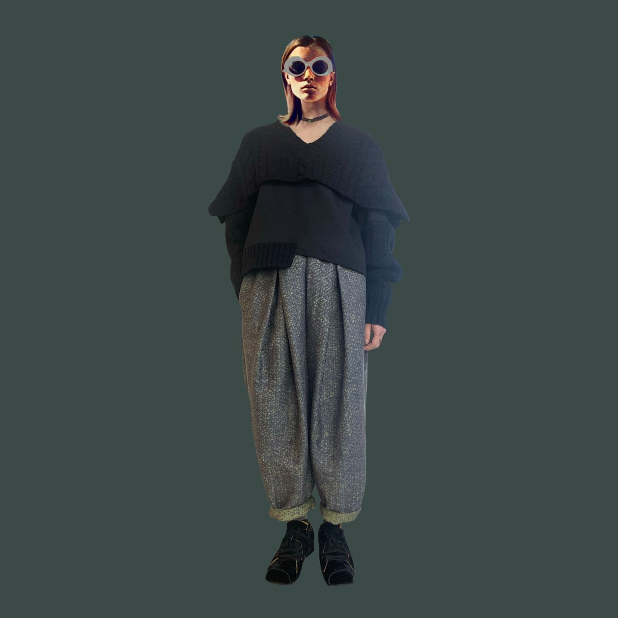 ウエストリブの深いボックスタックがあるパンツ。