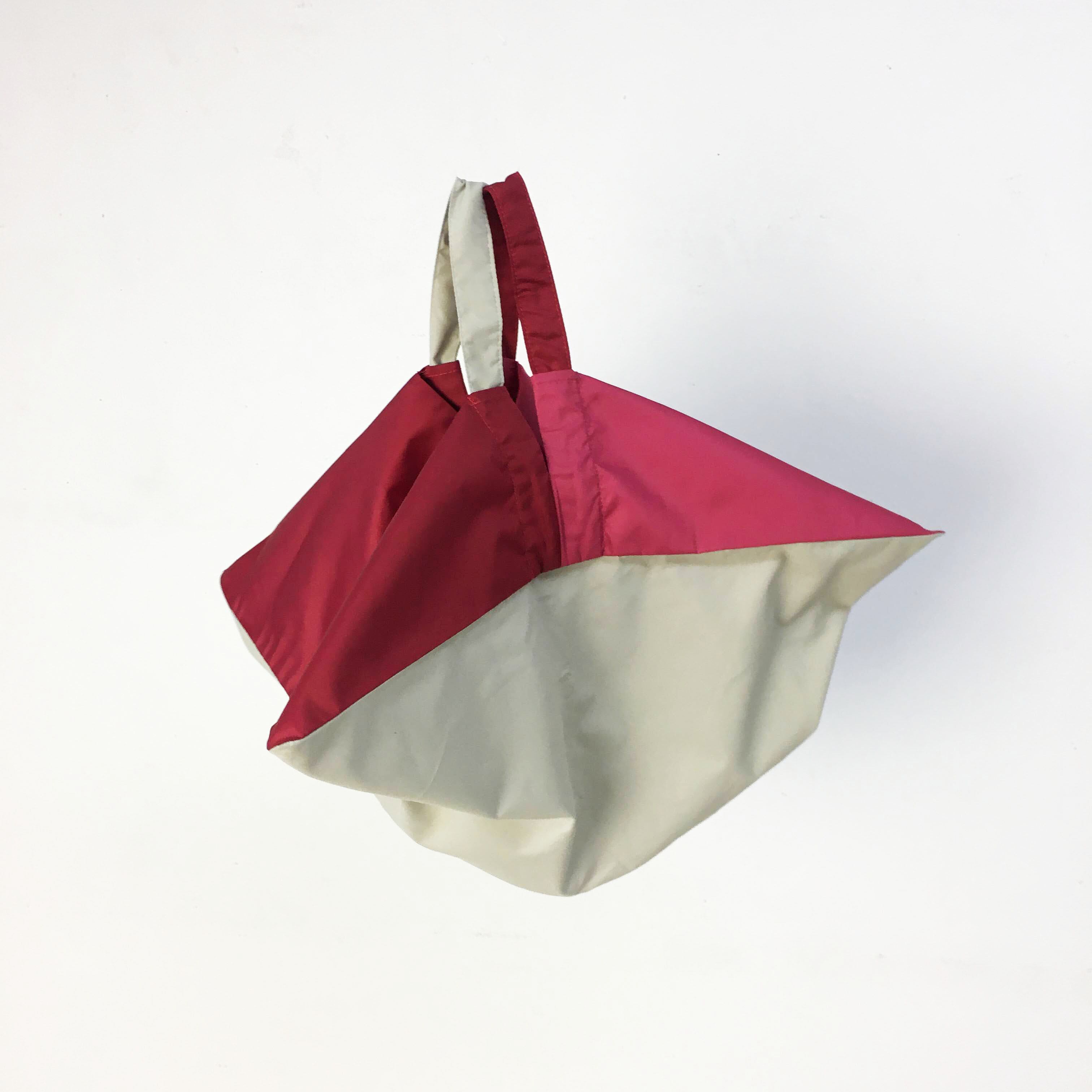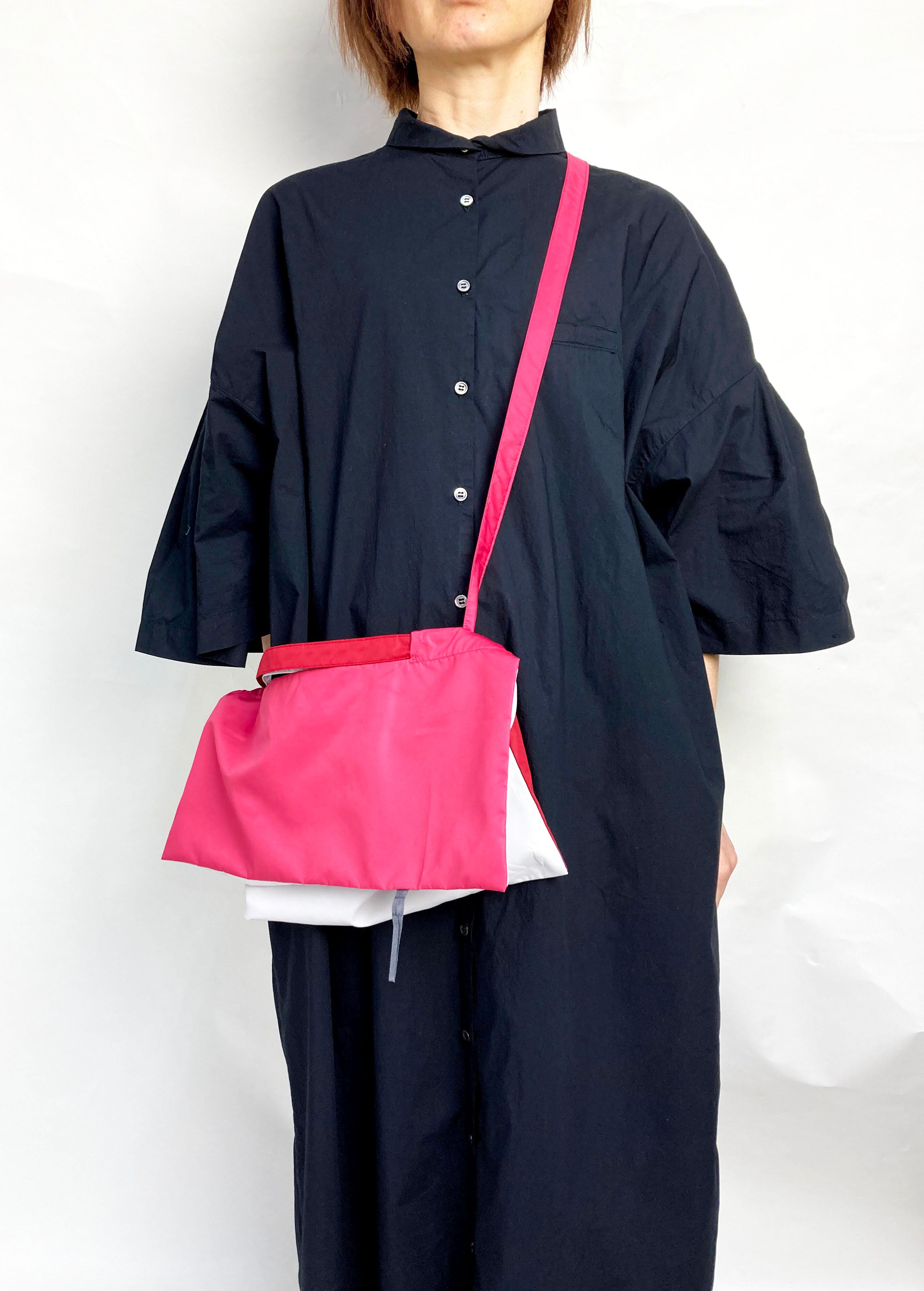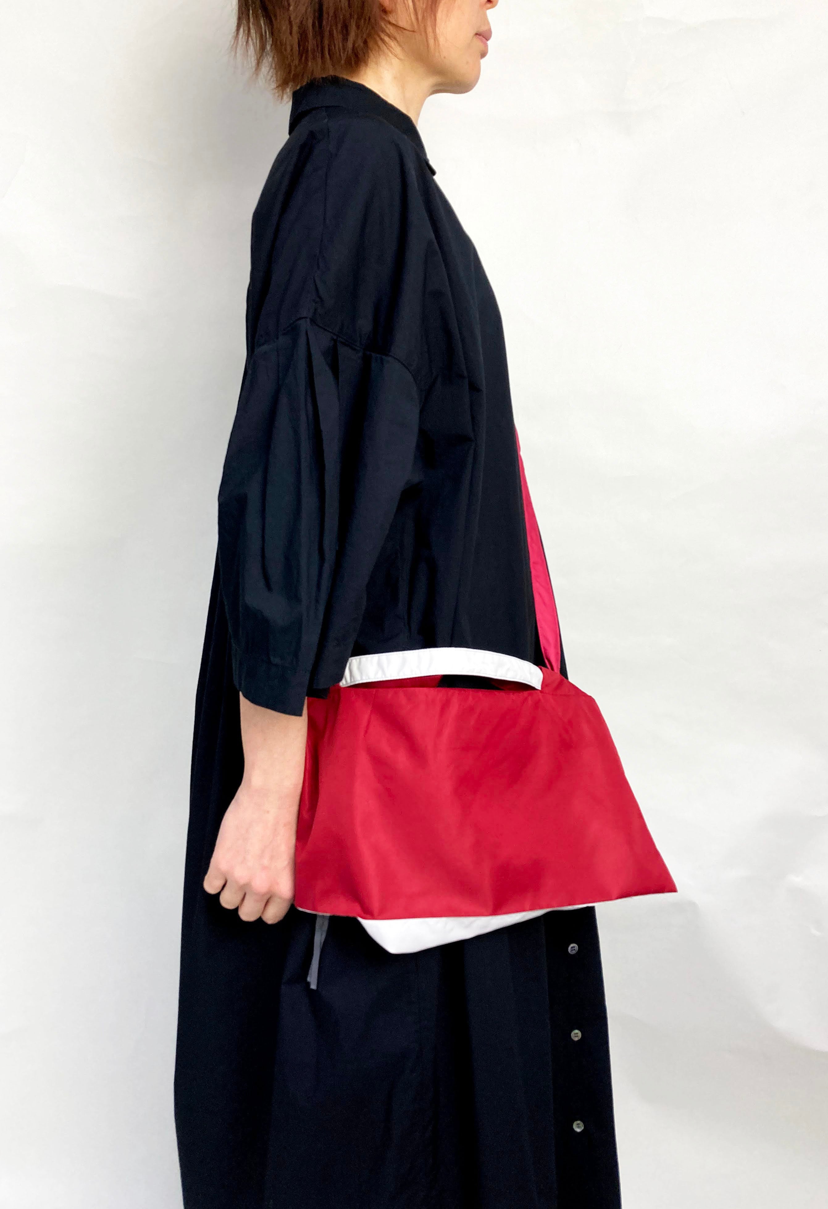 ハンドルを引っ張るとギャザーが寄り、肩にかけられます。