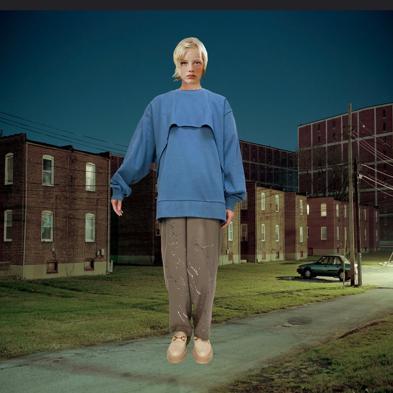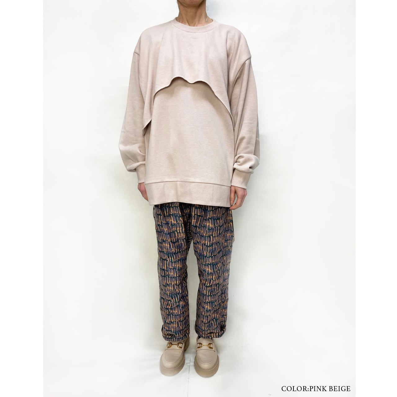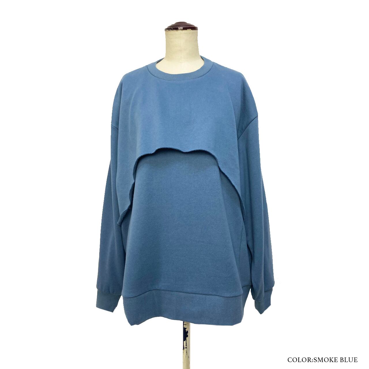 前身頃上部の裁ち切りのスウェット素材パーツは若干のフレアになるように設計されており